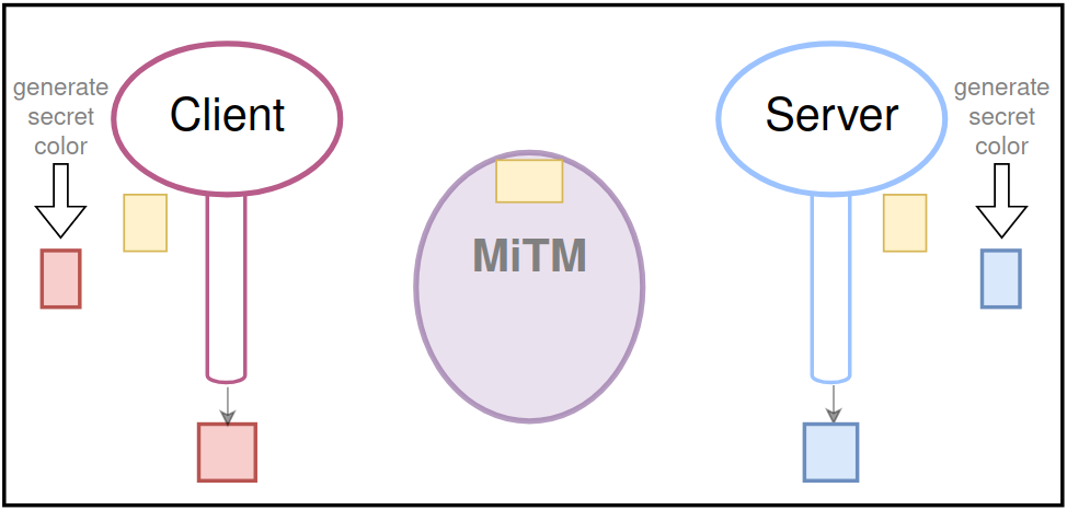 - First Client and Server agree on a public color, let’s say YELLOW. (to agree to yellow, it’s sufficient that one sends the other, as in the symmetric key example also the MiTM obtains it)
