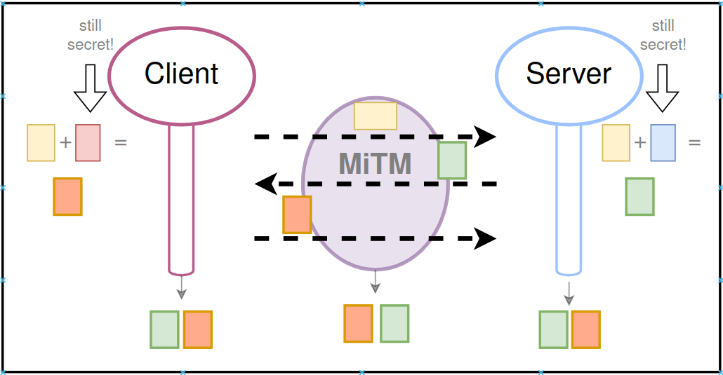 Now Client and Server mix the color they received from the other party to their secret one , obtaining the same shared color (BROWN), unknown by the MiTM.
