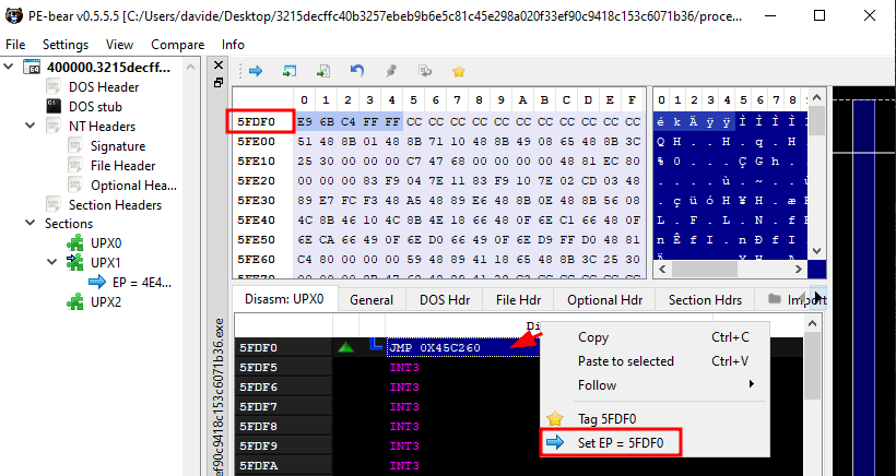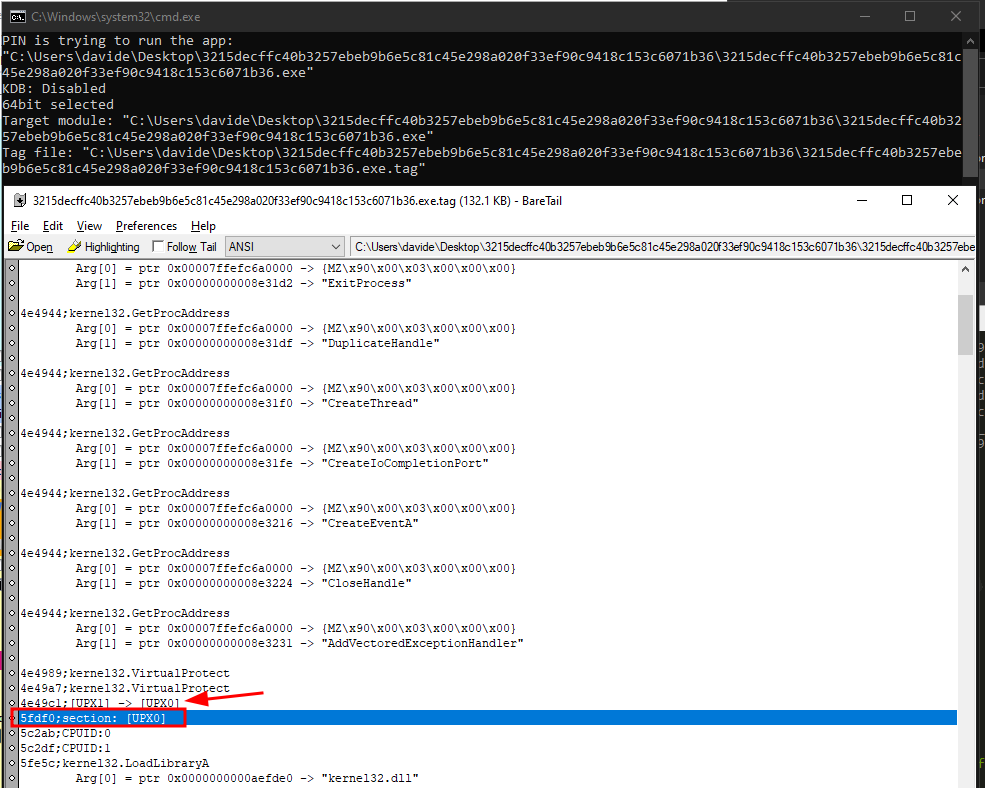 To debug the sample, we need to fix the dumped sample’s entry point and set the sections as executable. For the first actions, we can use tiny_tracer , which will help us to track the section jumps. Right-clicking on the sample and selecting “Run with PIN (Tiny Tracer)” , will start to collect some execution artifacts, saving them into a “.tag” file that we can open with BareTail .