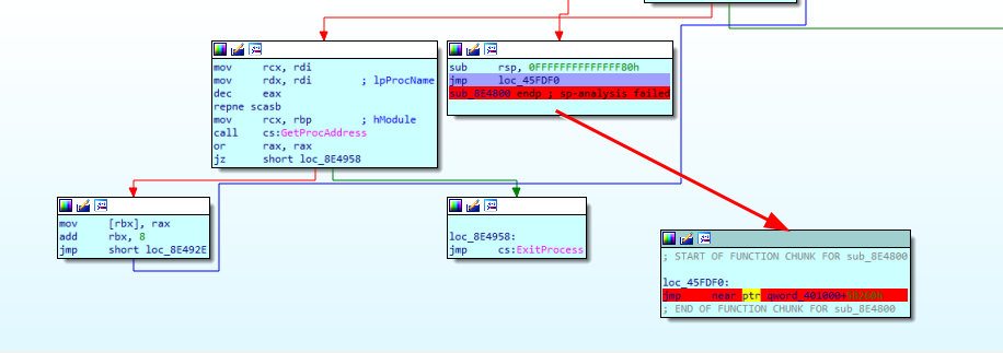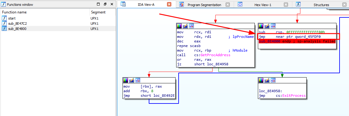 We can see that section UPX1, where we are now, is not that huge (from 729000 to 8E5000), so we might expect the TAIL JUMP into another section. By the end of the graph representation of sub_8E4800 method, we can notice the direct jump to an address in the UPX0 section.