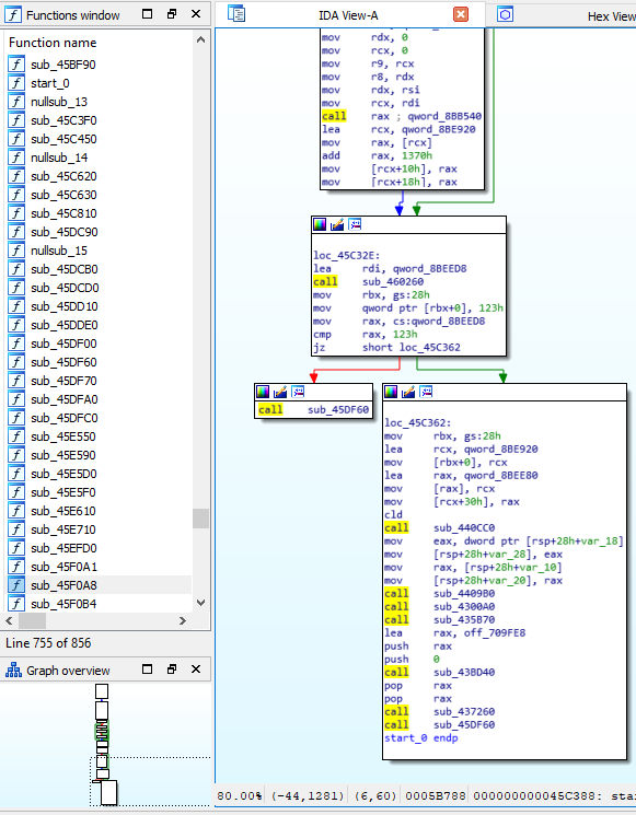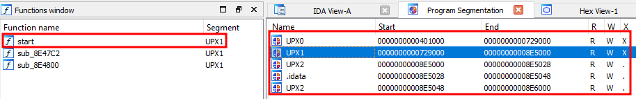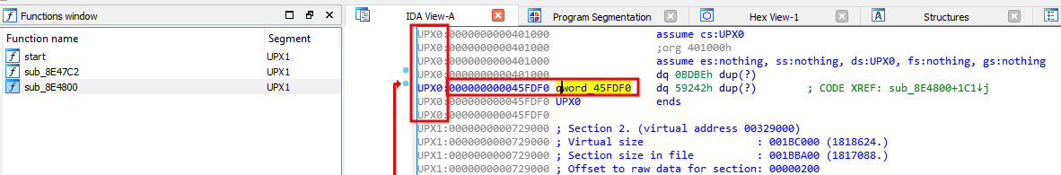 In particular, we are searching for jumps from the entry point section to any other section, and we can check which section the program starts by looking at the Functions window. Instead, in in the Segments window (View→Open Subviews → Segments), we can learn what the address ranges for the sections are, which is a piece of very precious information for our search.