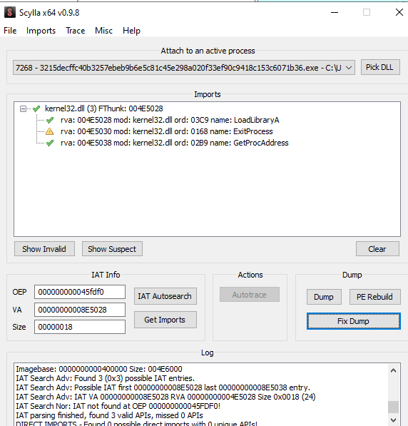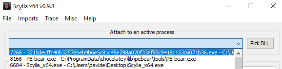 Now it’s time to use Scylla to dump the memory and reconstruct the IAT. Open Scylla and select the process IDA is debugging