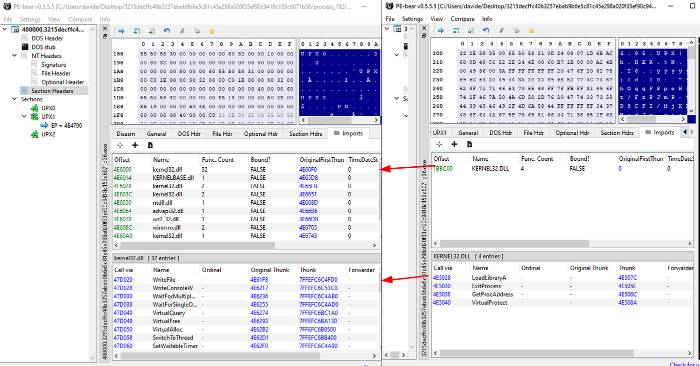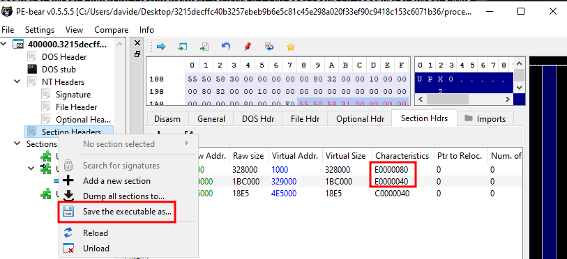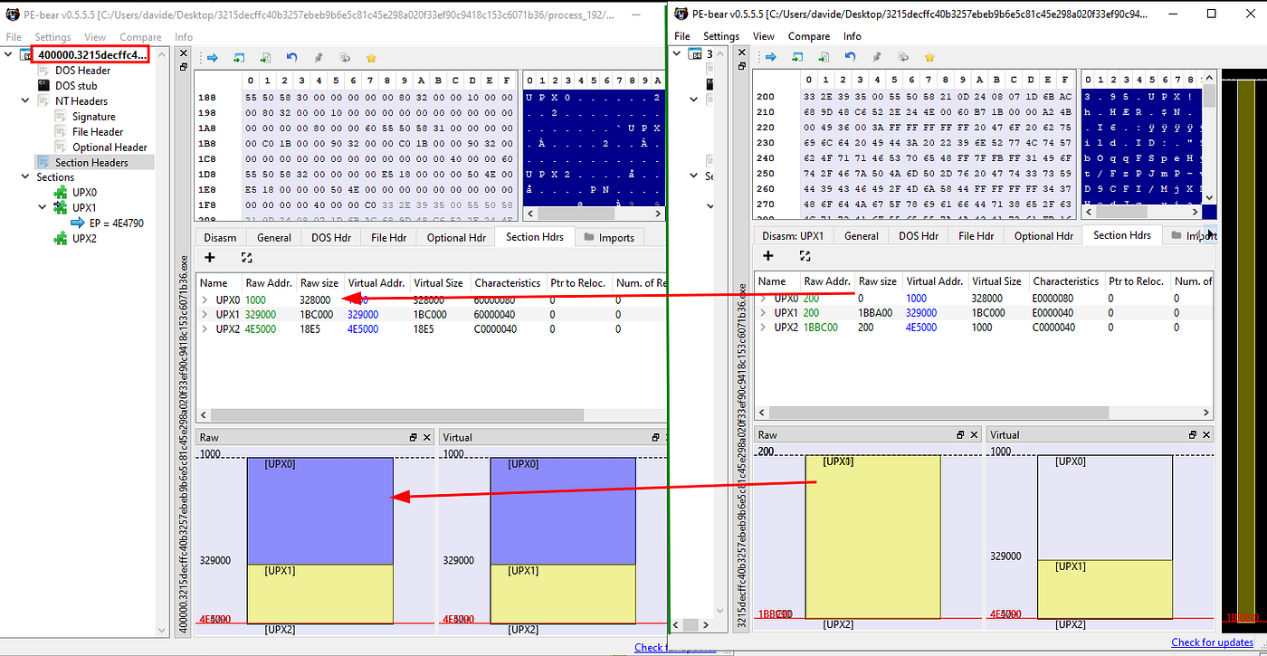 Comparing the sample with the Dump, we can observe how the raw size of section UPX0 is changed from 0 to 32800 bytes.