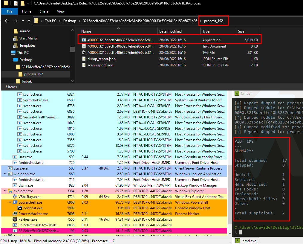 Pe-sieve is going to create a folder with the memory dumps it spotted during the analysis and a JSON file with the result: